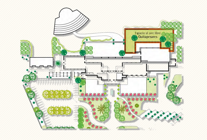 Delante del Molino, mirando a la ciudad, hay una doble terraza ajardinada que recibe el nombre de Quitapesares, en recuerdo de una hermosa huerta así llamada que existió en la sierra de Córdoba. En las celebraciones de boda suele tomarse aquí el aperitivo, cuando la cena se sirve en La Era. Y en el Cenador que preside la terraza más baja, con las mejores vistas, es donde tienen lugar a veces la ceremonia matrimonial civil, engalanándose el recinto para la ocasión.